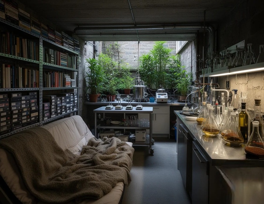 Die Küche, Herzstück ihrer privaten Alchemie, besticht durch eine Edelstahlzeile und eine mobile Insel auf Schwerlastrollen. Zwischen Magnetrührern und einem Autoklaven lagern Gewürze in Erlenmeyerkolben, um sie vor Oxidation zu schützen. Zur Optimierung der Luftqualität im fensterarmen Souterrain dient eine Armee aus Bogenhanf und Grünlilien. Diese „botanischen Luftfilter“ erfüllen ihre Aufgabe mit einer Effizienz, die Isla zutiefst respektiert.